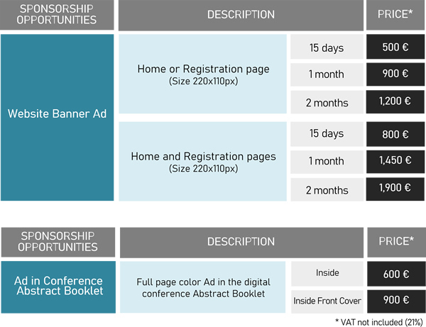 - Advertisement – Banners, Program Ads, Logo Displays (Landing or registration pages, Abstracts booklet)