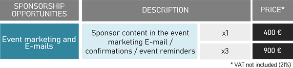 Opportunity for sponsors to hang a banner, place an advert in the event program, landing or registration pages or display their logo. Sponsors will gain more exposure and opportunity for ongoing interaction with attendees.